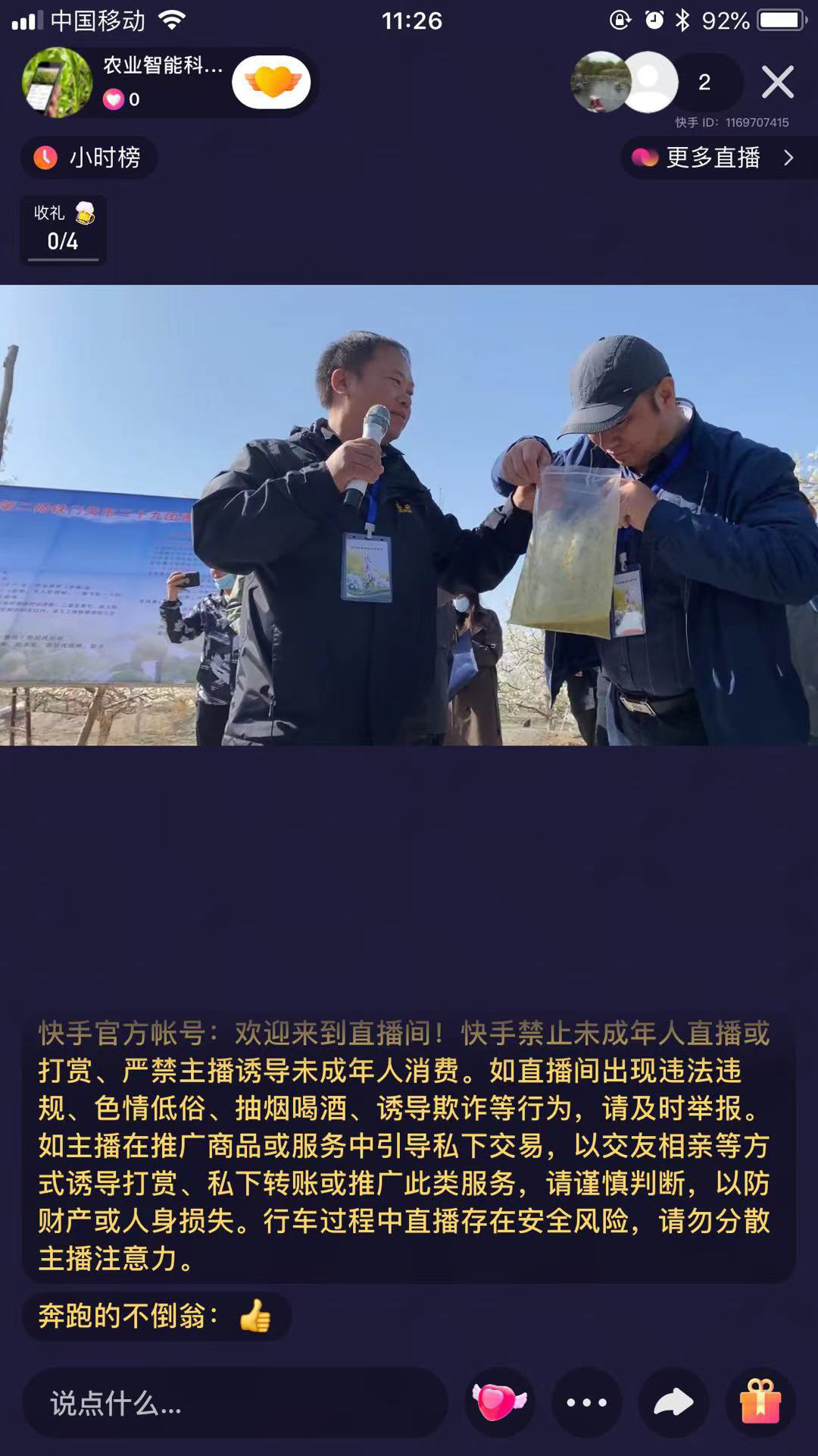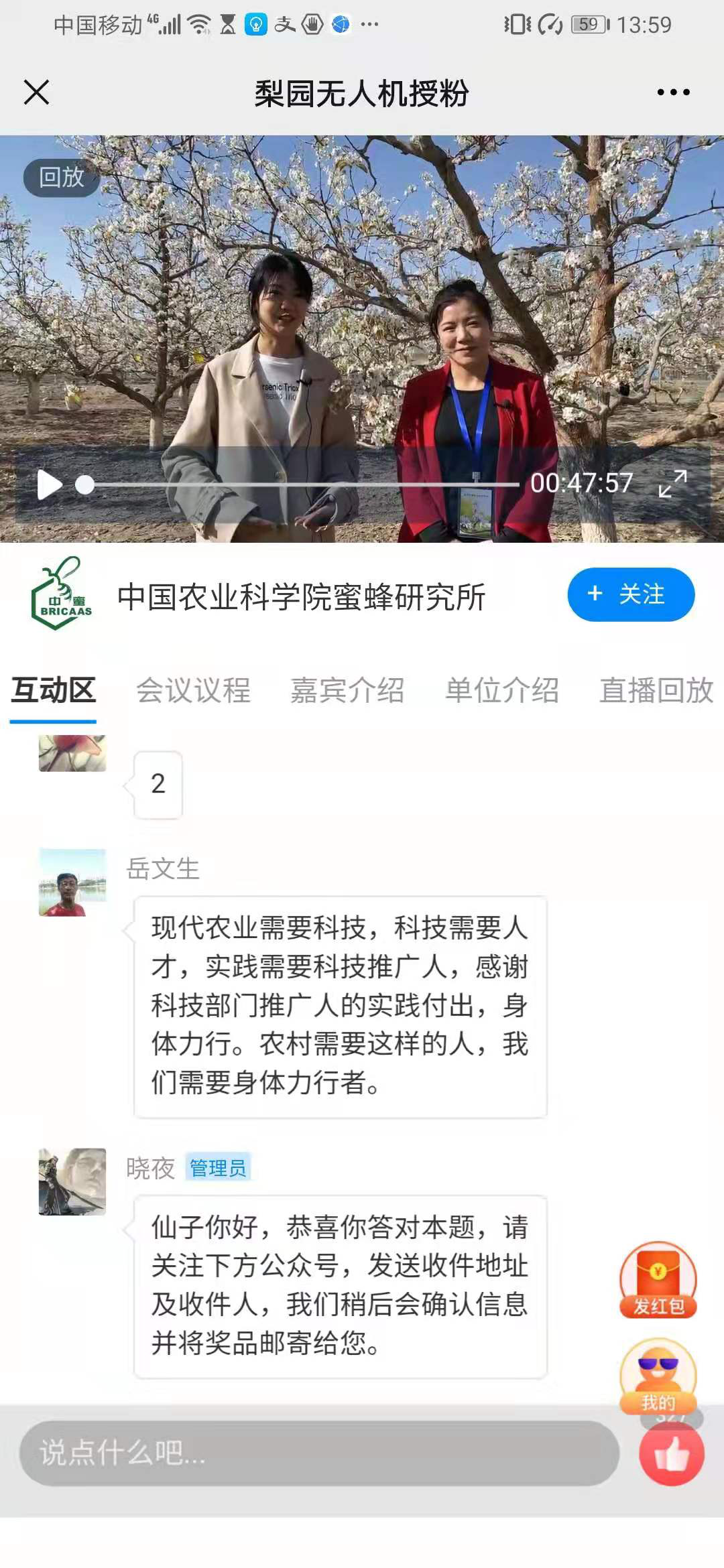 会议当天,直播工作顺利进行。通过云犀和快手直播平台,为未能到场的用户顺利提供了安全高效液体梨园授粉技术线上免费直播服务,并支持会后直播回看。同时智能农业技术研究室还利用无人机对观摩现场进行了航拍,以便获取更为清晰、全面的授粉场景。直播期间,共有近480多人次观看直播,直播活动得到用户好评,许多基层工作人员积极配合组织当地农户观看了直播。
