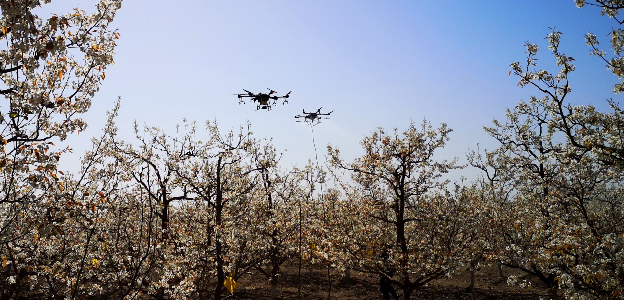 2018年起,蜜蜂所针对梨树授粉难的技术需求,选择以液体授粉技术花粉的获得为突破口,无人机的高效喷施为手段,构建了基于蜂花粉的无人机高效液体授粉技术体系。经过两年多试验与示范的结果表明,基于蜂机协同作业的无人机液体授粉技术具有安全高效、节本增效等特点,这种授粉方式可使香梨花序坐果率高达81.4%,远超50%的实际需求,后期每亩增产可达500公斤以上,每亩增收2000元以上。